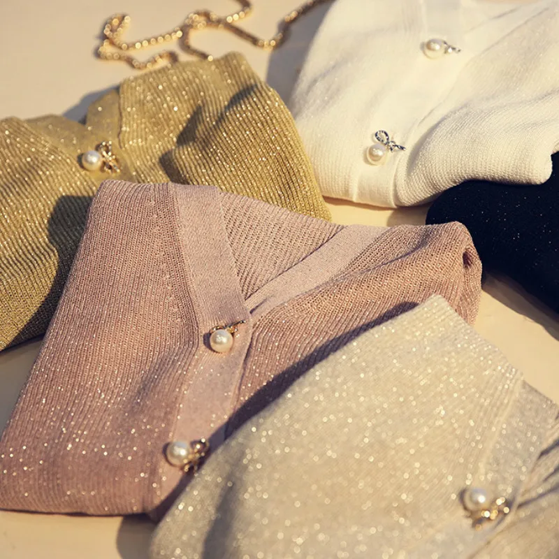 Good Offer for OL V-neck Sweater Knitted Cardigan Bright Silk Pearls Button Hollow Jacket Loose Single-breasted Co