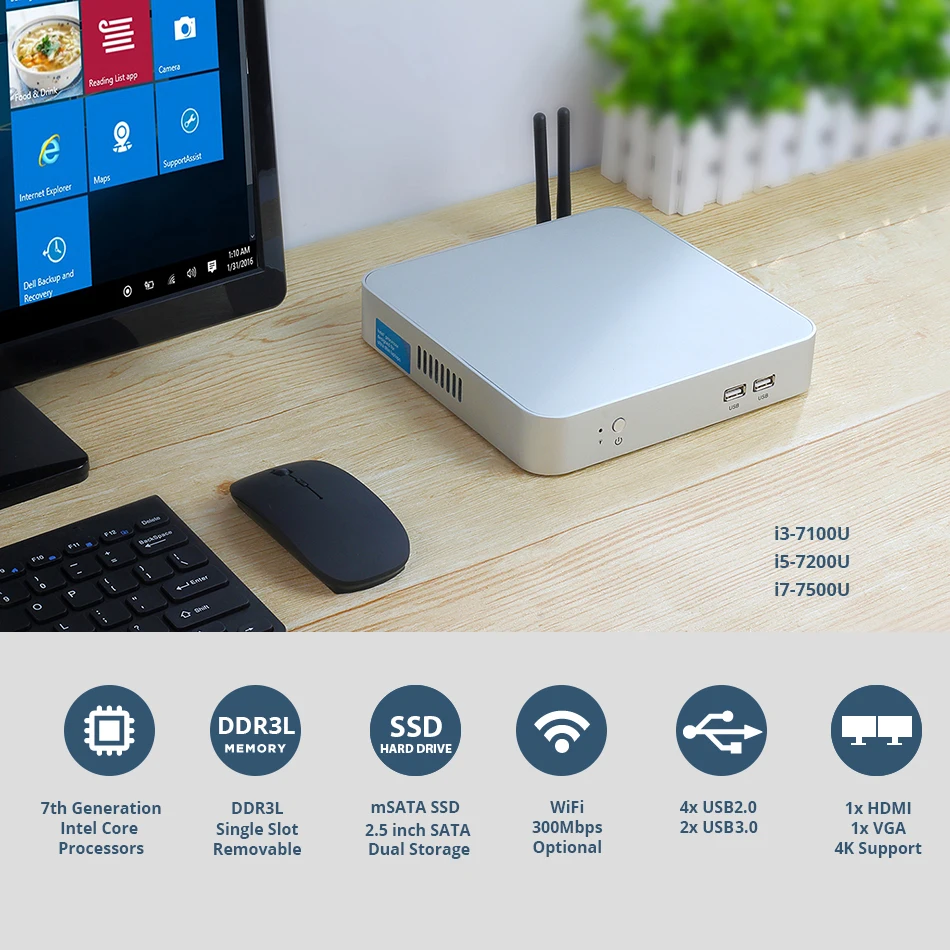 7th Gen Intel Core Mini PC i7-7500U i5-7200U i3-7100U Windows 10 Linux 4K UHD HTPC HDMI VGA 6*USB 300M WiFi Gigabit Ethernet