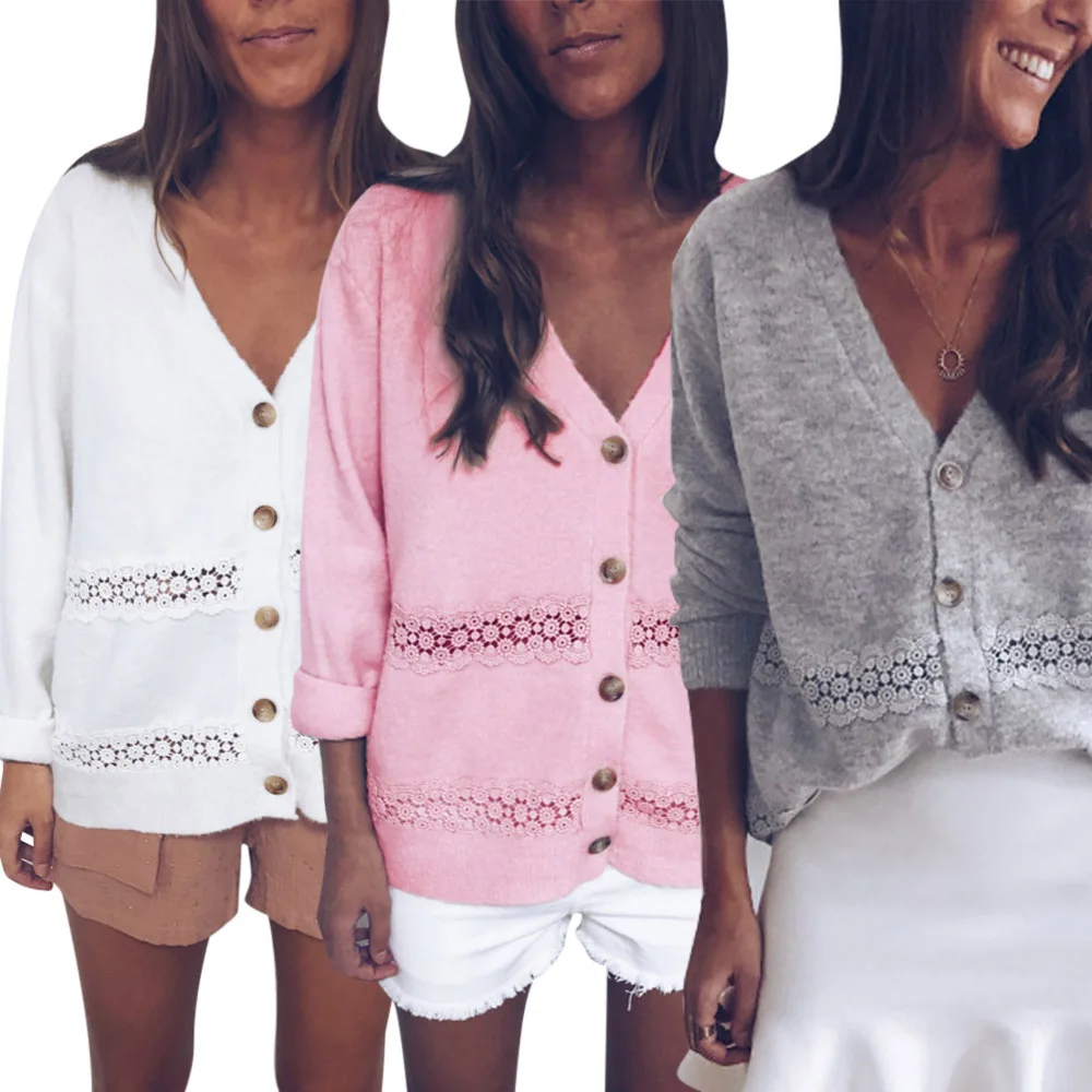 .image of Knitted Lace Patchwork Women Cardigan Sweater 2019 Autumn Fashion Simple Solid Bottom Clothing Swea